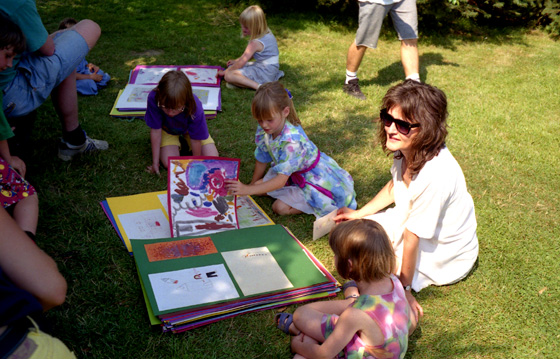 von links nach rechts: Praktikantin Galina, Betreuerin Tanja, Praktikantin Sonja, Betreuerin Barbara zusammen mit einigen Kindern der Kinderladenfreizeit 2003