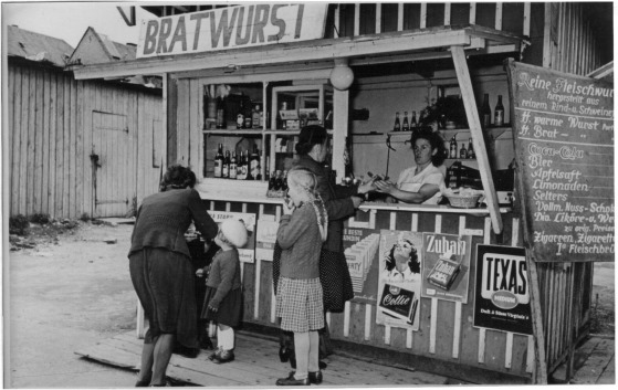 Mutti in der Wurstbude Seltersweg/Ecke Plockstraße. Man beachte die Reklameschilder: in der Mitte “Ihring Melchior Bier”. Links und rechts die damalige neue Zigarettenmarke “Texas”. Dann die alte “Ova” und rechts neben der Bierreklame die für mich als Kind interessanteste Zigarettenmarke “Liberty”: Zu ihr gab es in kleinen Heftchen ein für uns Deutsche damals völlig neuartiges Gebilde, nämlich Comic-Strips mit ‘Old Joe’, die mir und meiner Mutter ausnehmend gut gefielen. - Rechts daneben dann die Zigarettenmarken “Collie” , “Zuban” und nochmals “Texas”. Coca-Cola kam erst später - meines Wissens 1952.